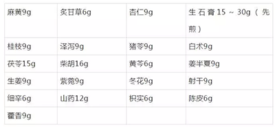 清肺排毒汤是中医经典方剂组合,包括了麻杏石甘汤、射干麻黄汤、小柴胡汤、五苓散,由21味药物组成,包括麻黄、炙甘草、杏仁、生石膏(先煎)、桂枝、泽泻、猪苓、白术、茯苓、柴胡、黄芩、姜半夏、生姜、紫菀、冬花、射干、细辛、山药、枳实、陈皮、藿香,水煎服,一天一服,3服一个疗程,早晚两次(饭后40分钟),温服。