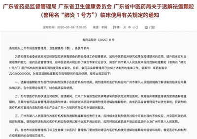 ° 2月7日,国家中医药管理局发布通知,正式将清肺排毒汤推荐给全国各地的医疗机构辨证运用。