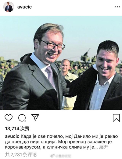 据《波士顿先驱报》报道,当地时间4月8日晚,塞尔维亚总统武契奇称22岁的儿子达尼洛感染新冠病毒,已住院治疗。武契奇在社交媒体上公布了这一消息,并附上父子俩的合影。他为儿子打气:“儿子,你会赢的。爸爸爱你,我们都爱你!”据了解,武契奇育有两子一女,达尼洛是其长子。两天前塞尔维亚总理布尔纳比奇在电视上提到武契奇总统的儿子达尼洛和女儿米利卡在疫情期间担任志愿者,为老年人提供服务。